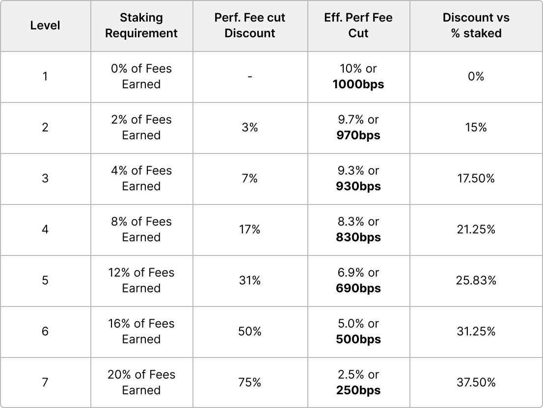 Asset managers may avail a discount on the performance fee cut based on the amount of $DFV LP staked. \